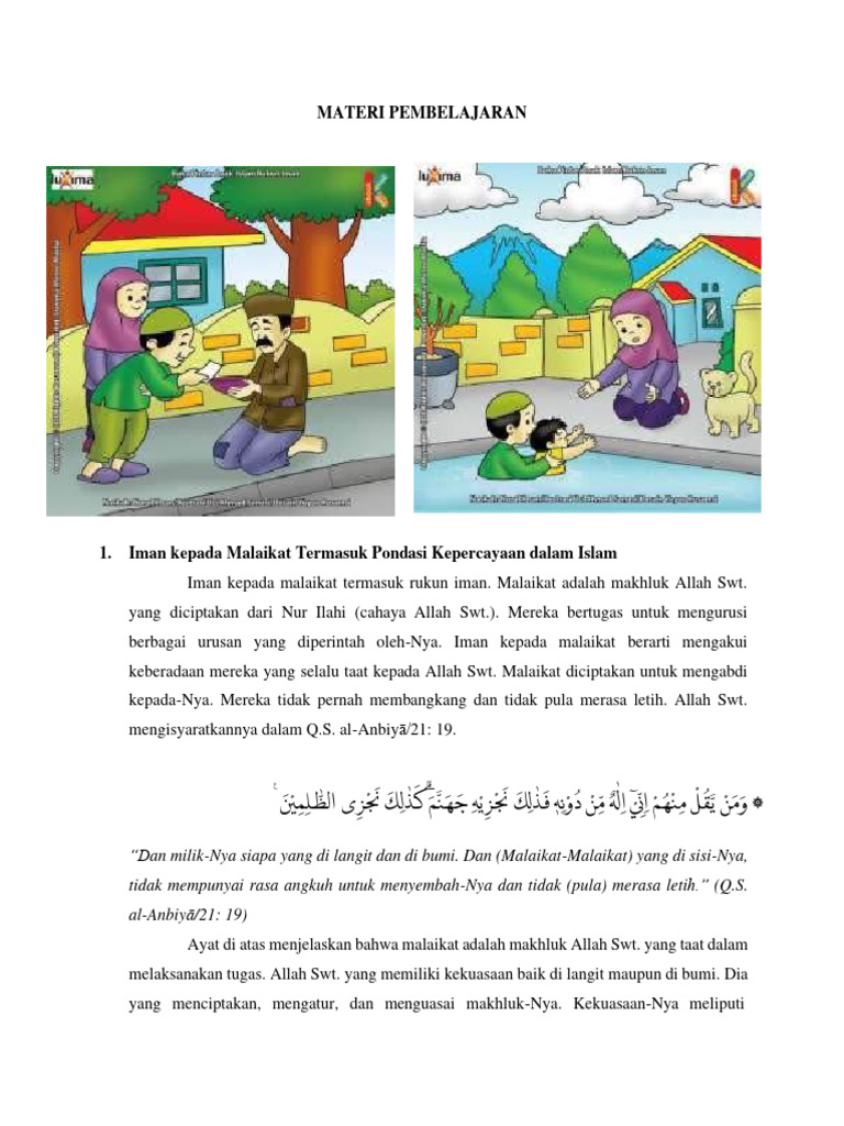 - Malaikat Allah: Pengenalan nama-nama malaikat yang wajib diketahui (Jibril, Mikail, Israfil, Izrail, Munkar, Nakir, Raqib, Atid, Malik, Ridwan) beserta tugas-tugas pokok mereka.